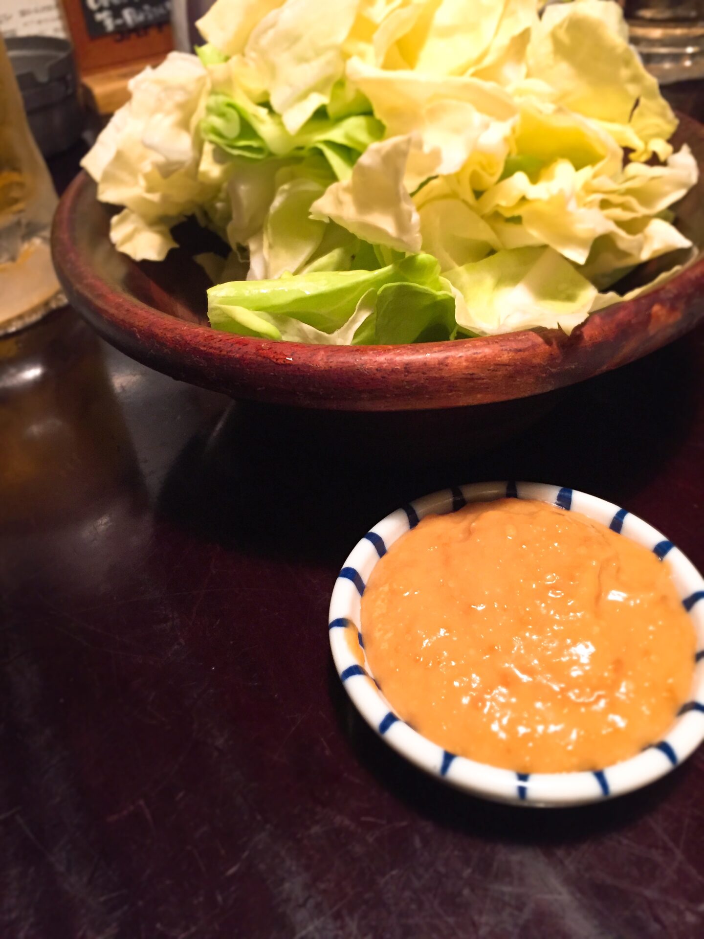 お通しのキャベツはおかわり自由。味噌とマヨネーズかな。