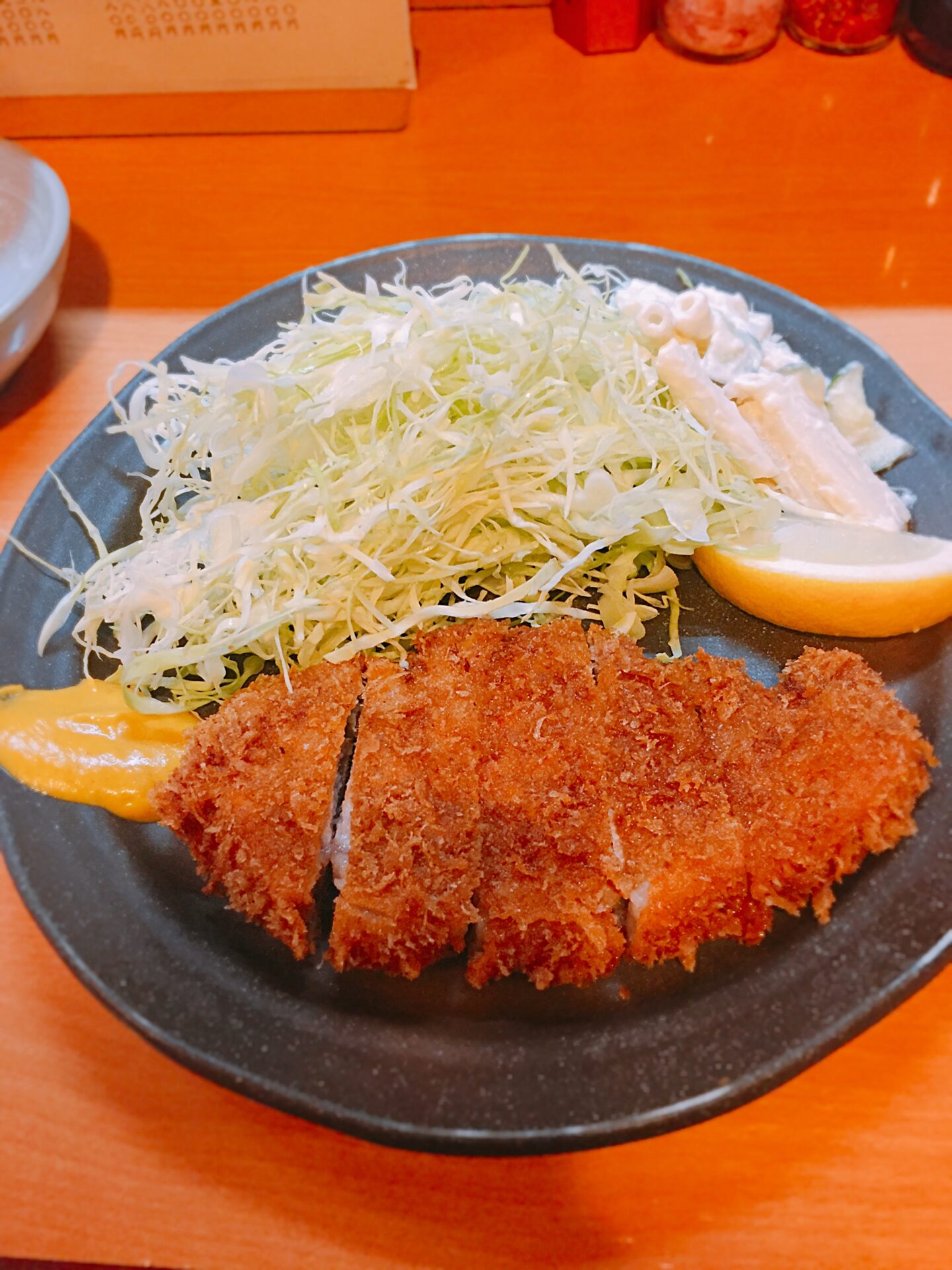 私はおろしトンカツ。彼女はロースニンニク焼きを注文。