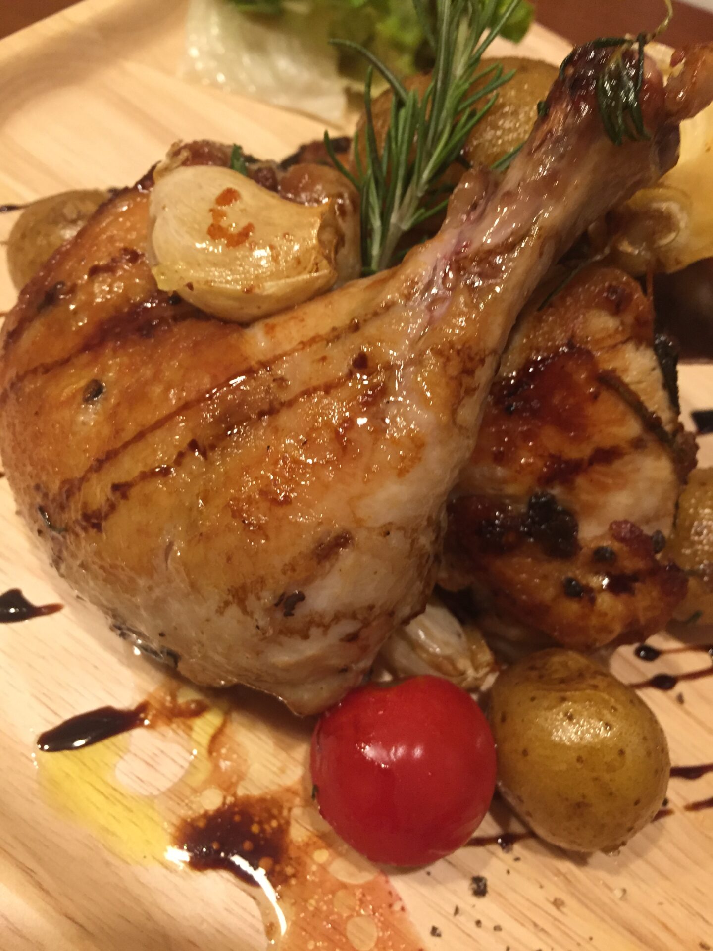 ローストチキン。ローズマリーとニンニクが加えて焼いてある。美味かった。にんにくは潰して食べるといいですね。
