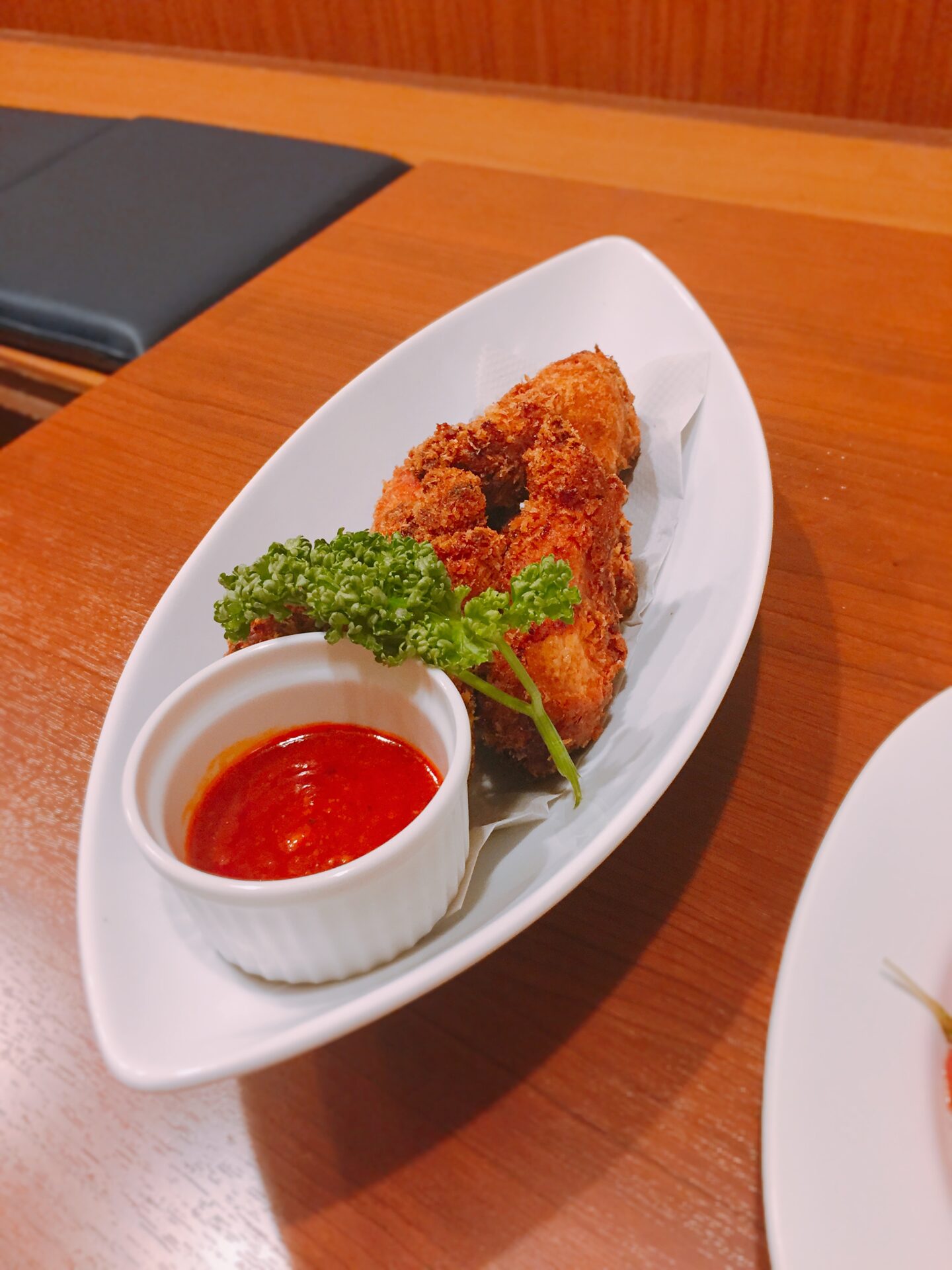 スパイシーでうまい。ソースを付けなくてもうまかったけれど、つけると味が変わって楽しめる。揚げたて。