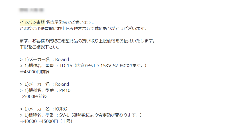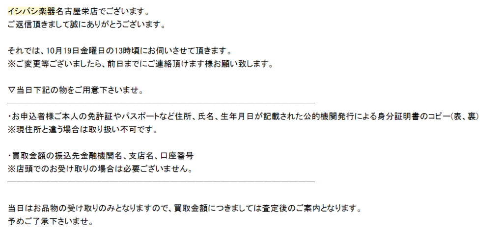さて、前回はイシバシ楽器に出張買取を申し込みました。