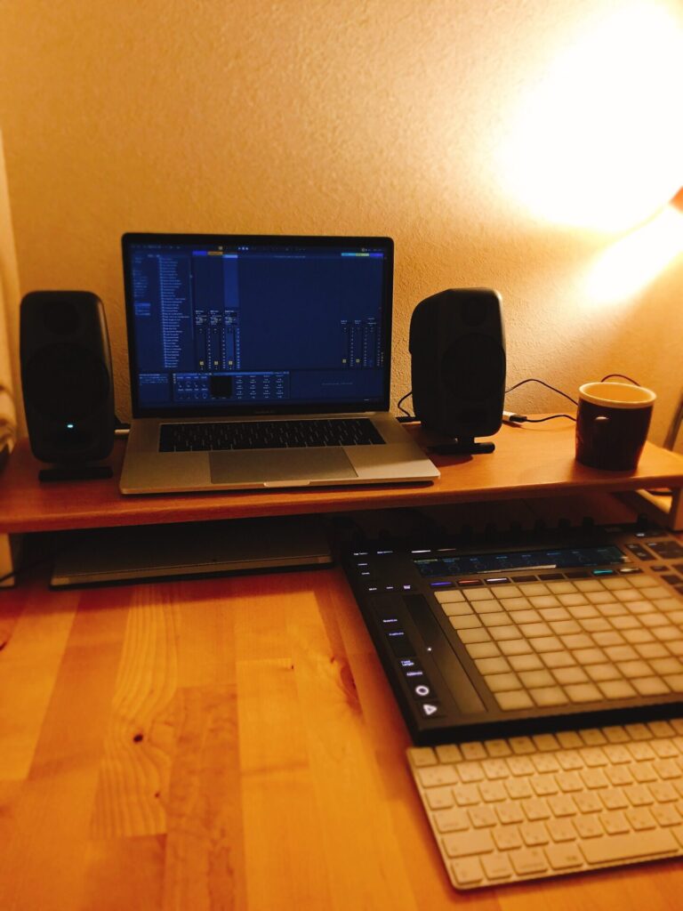 デスクの上には、MacBook Pro、iLoud Micro Monitor,Ableton PUSH2、マウス、キーボードです。