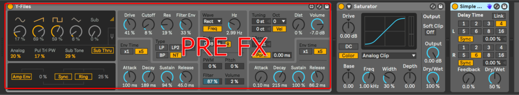 これ、Ableton Liveのインストゥルメント立ち上げてあるわけだけど、Preって「前」ってことだよね。FXはエフェクターを意味するから、エフェクター掛ける前の音が、Ableton Liveのトラックに流れるということだね。