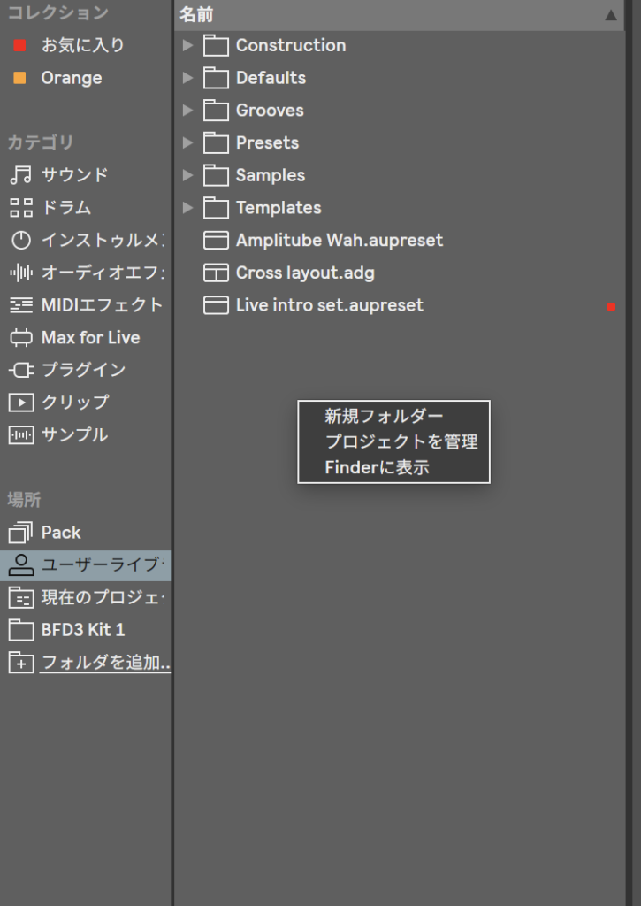 ユーザーライブラリーを選択して、それから、右クリックして、新規フォルダーして投げ込むのもええと思う。Live10からお気に入り機能が出来たから、数字キーでお気に入りにいれてもいいと思うよ。