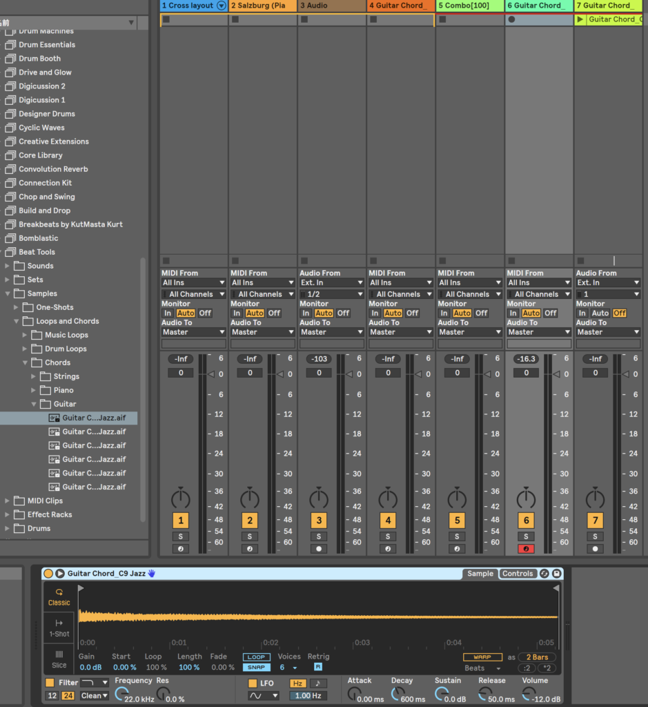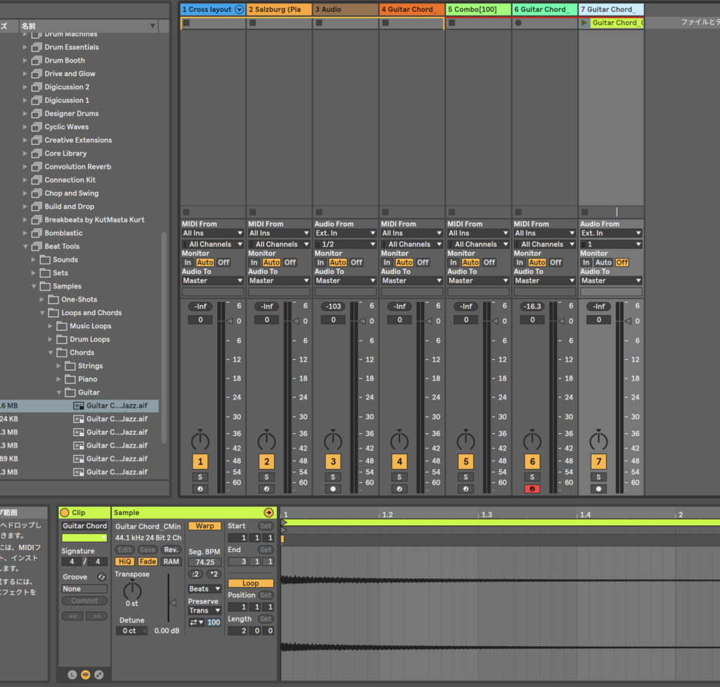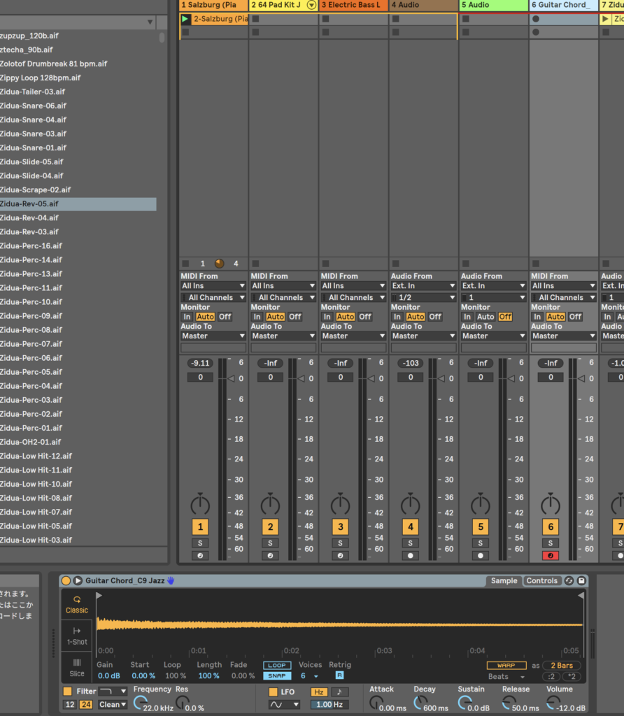 これ、6トラックと7トラック目は同じサンプル。6トラック目はPUSHから読み込んだものだから、Simplerが立ち上がっているのがわかるね。