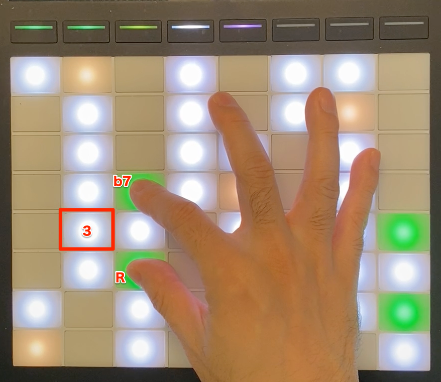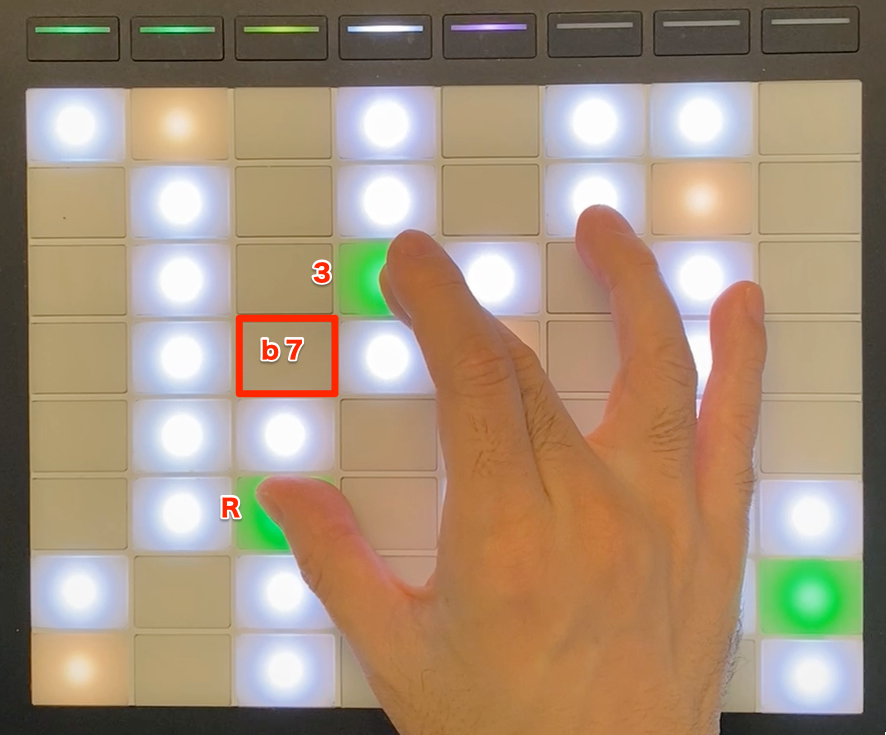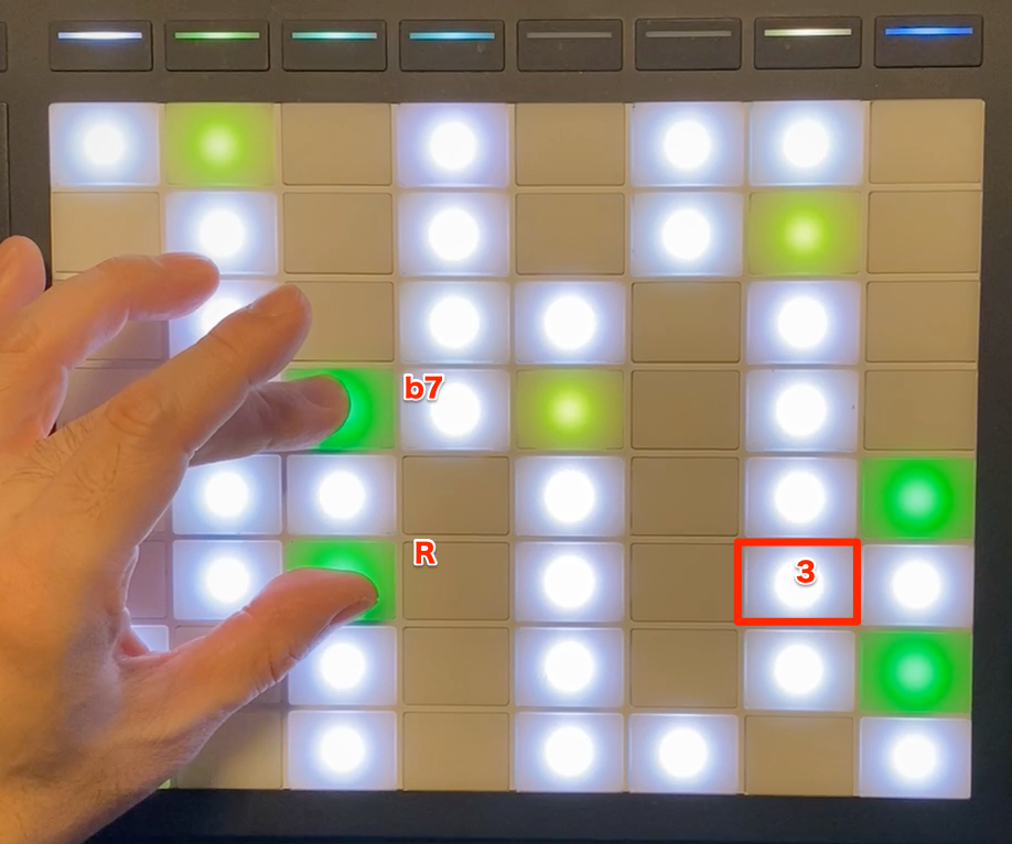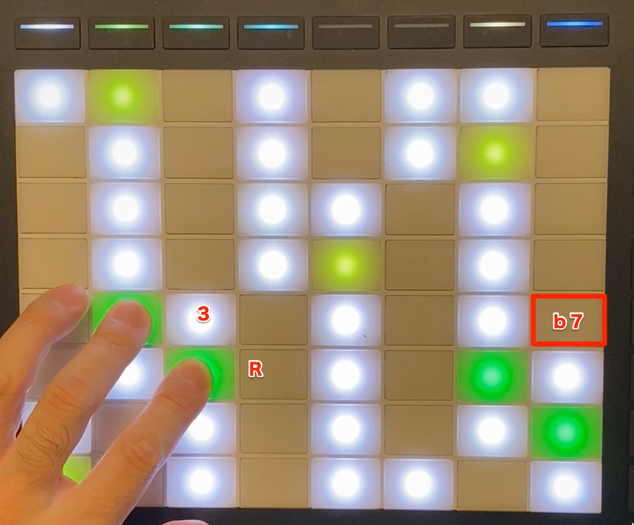 左手でRと3度を押さえて、b7をターゲットノートにします。