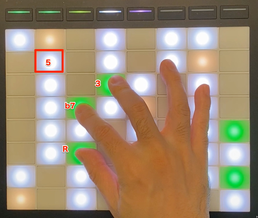 左手でRとb7を押さえて、5度をターゲットノートにします。