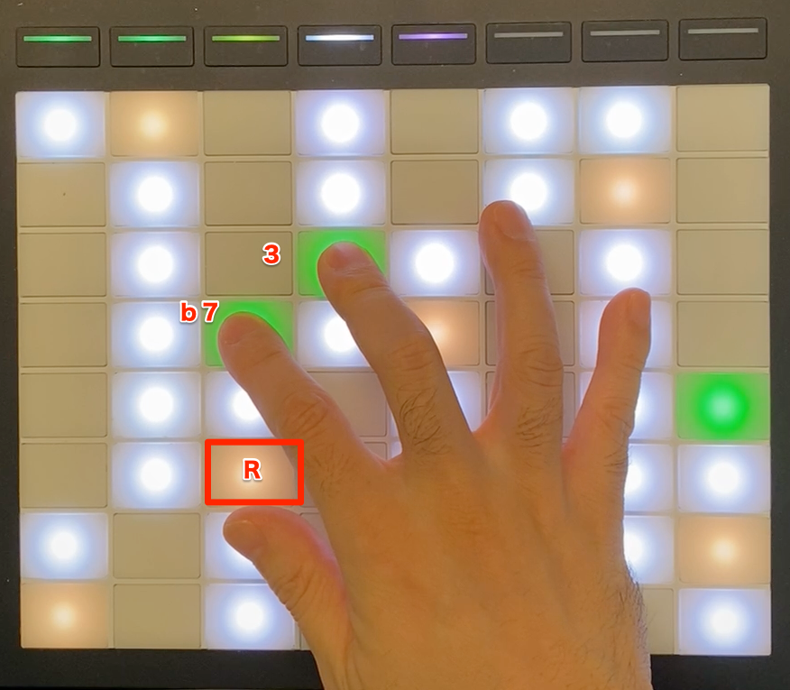 右手でRと3度を押さえて、b7をターゲットノートにします。