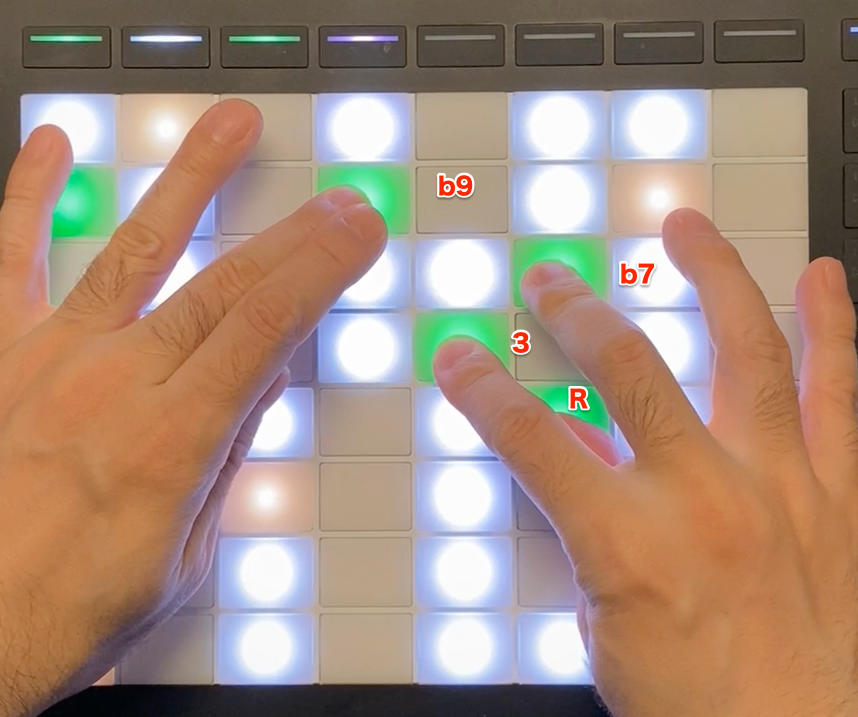 右手で173を押さえているのは、ローが濁らないようにするためです。b9は特徴的なサウンドですね。