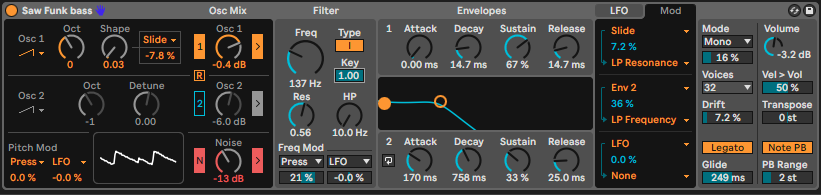 オシレーター2はレイヤーしませんでした。太さを求めるならば、倍音がないサイン波をレイヤーしてもファットになるでしょうし、Abletonなら単純にRack化すればいくらでもレイヤーできるのでこの辺りは好みですね。