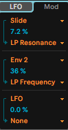 私はSlide(縦の動き)で微妙にレゾナンス(周波数で強調される)ところを加えました。つまみでレゾナンスをいじるのは難しいですが、上に動かすことで、ミョンと言わせたいのでこうしてます。