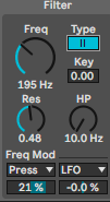 フィルターの閉じ方が一定だったら、高音域演奏したら音が出ませんよね。今回はベースなので0にしてますが、上の音域まで弾くなら適宜お好みで。リードに使う場合は1にしましょう。