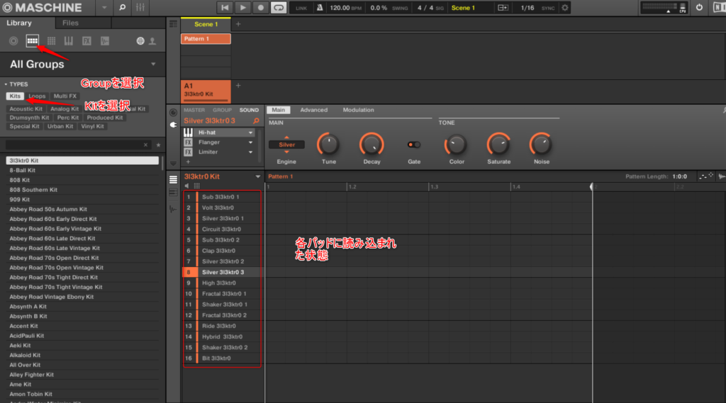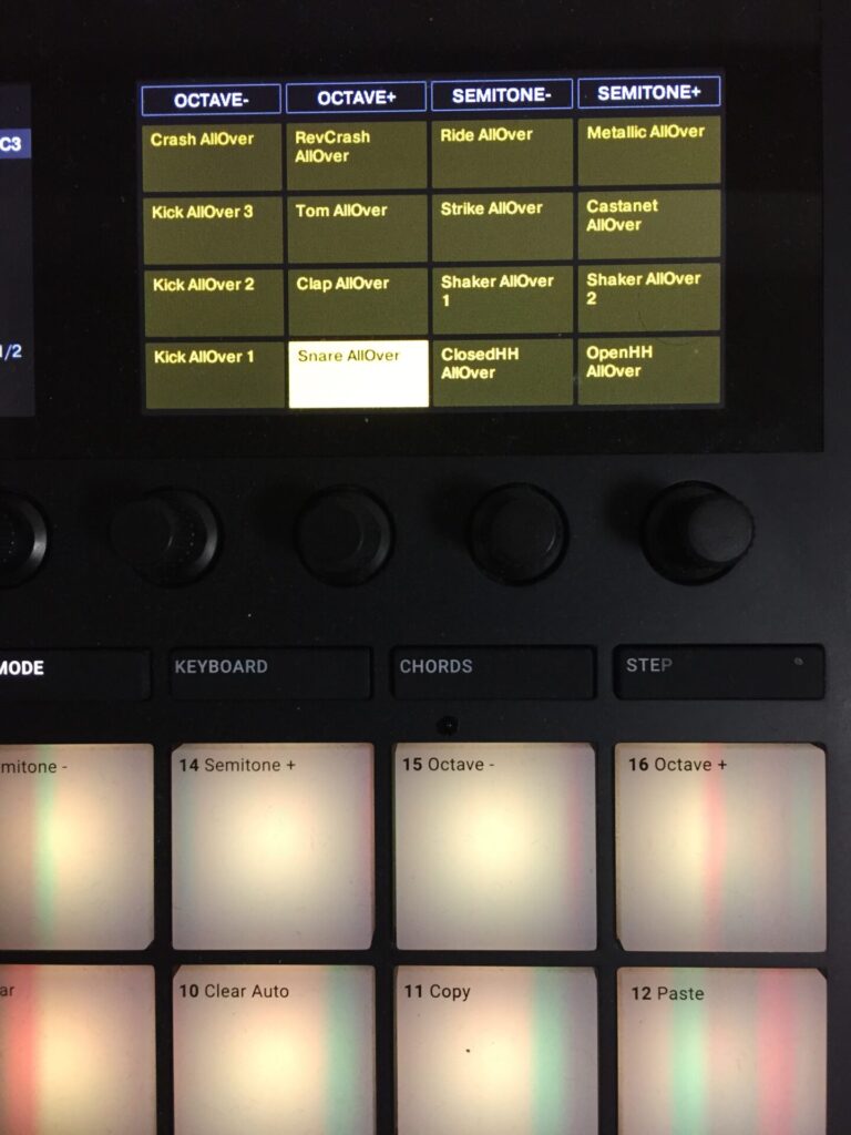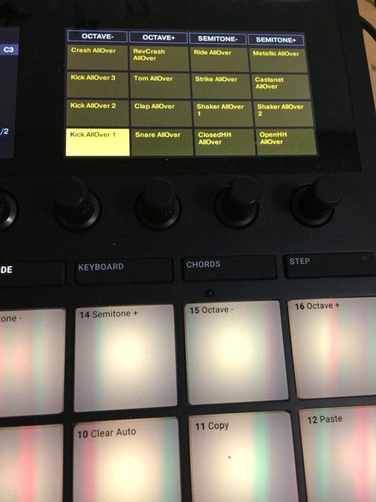 これを読み込んだ段階ではそれぞれのPADにアサインされていないので、Maschine本体のKEYBOARDを押せば、展開されます。