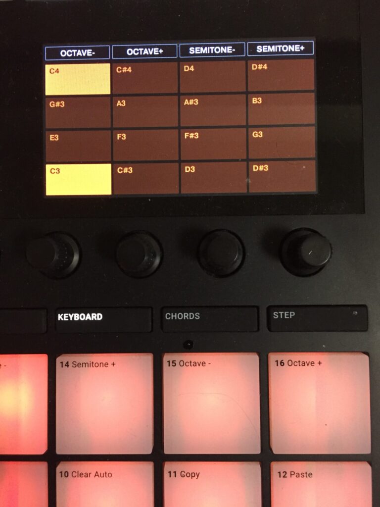 だから、KEYBOARDを押せば音がなるわけです。そして、注意する点としてはデフォルトではパッドの1番にC3という音階がわりあててありますが、ドラムの場合、C1から始まっているのが多いわけですね。ですから、コントローラーで調整します。
