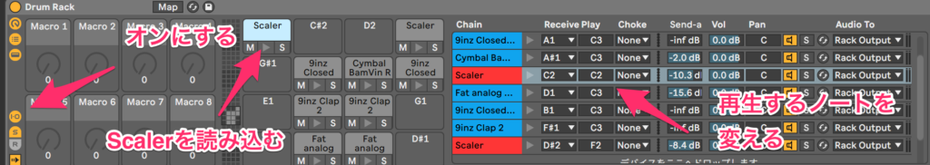 こっちは脳筋なやりかたね。Drumrackに一つ一つScalerを読み込んで、再生するノートを変えるようにして設定してある。