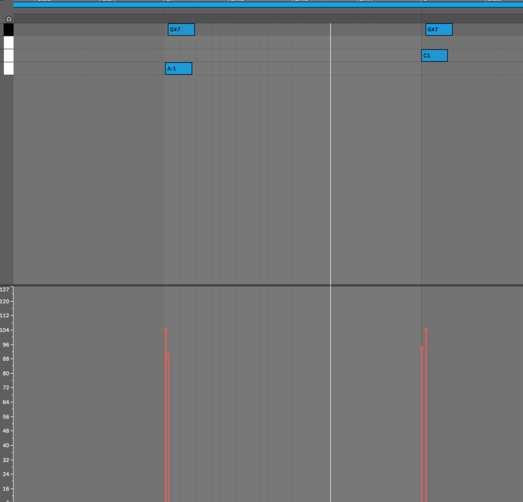 これ、EZDrummerのMIDIパックのJazz EZXというやつだけど、ライドとキックのデータ。ドラマーだったらどういうアーティキュレーションで演奏しているかわかると思うんだけれど、ドラムやらない人には難しいよね。ジャストじゃないのも見たらわかるだろうし。そして、ベロシティもわかる。