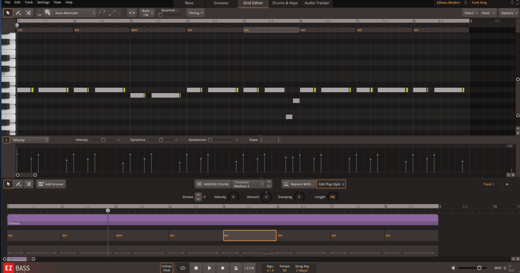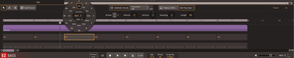 これ、結構メチャクチャな機能で、例えばStudio Oneならコード進行がコードトラックで打ち込めますから、それをEZBASSに読み込めば、フレーズが完成する。
