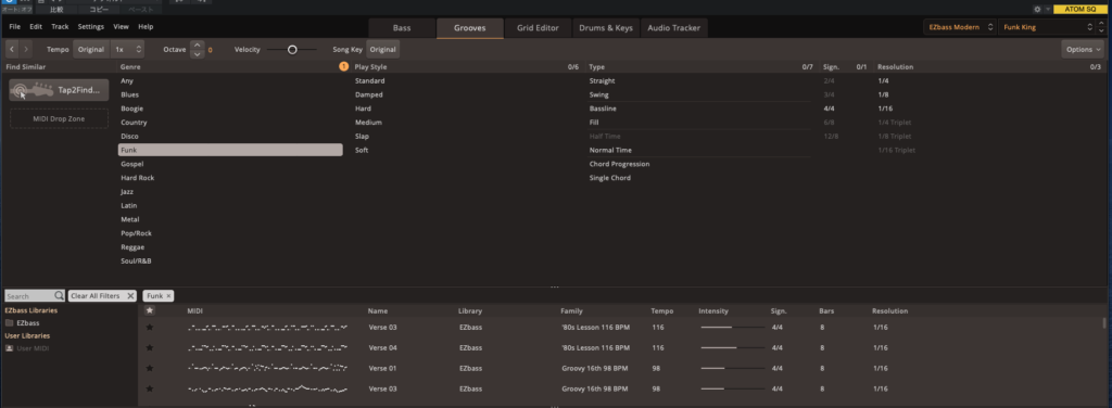 Ezbassと、Trilian、MODO BASS、Scarbeeなどとの大きな違いの1つは、MIDIデータを豊富に持っていることですね。