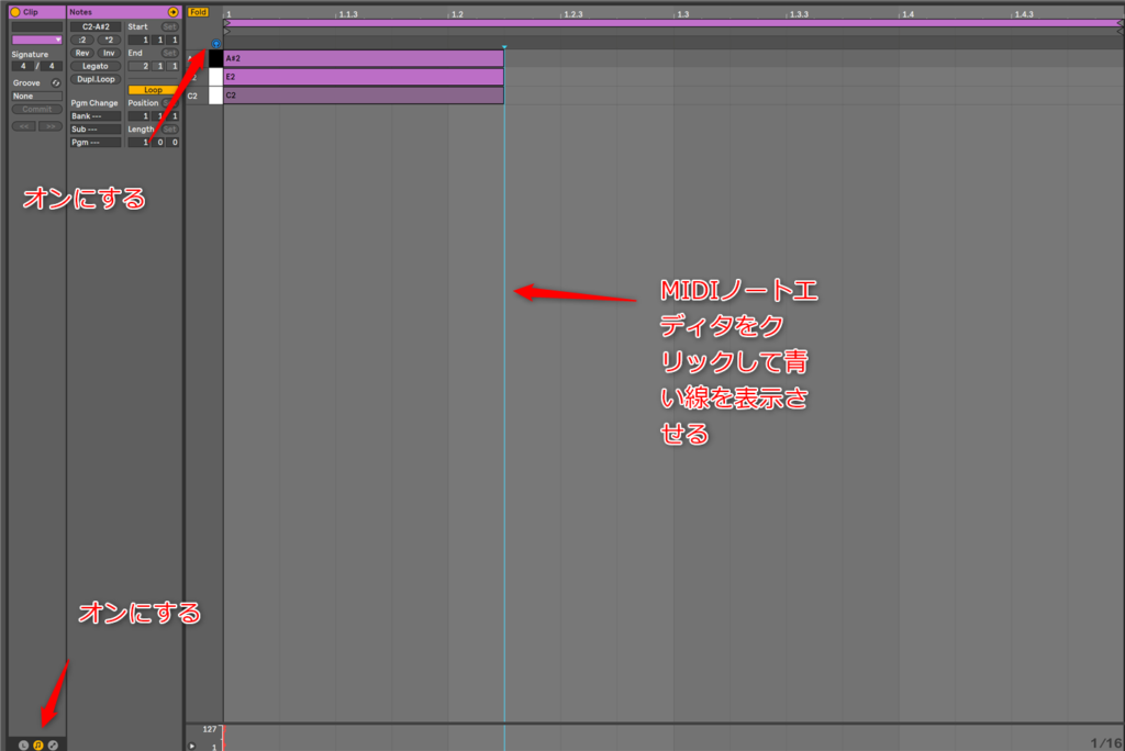 | ナッジ(微妙に動かす) | cmdを押しながら左右矢印キー | Altを押しながら矢印キー | shift+cmd+矢印で、グリッドを無視して、微妙にノートの長さを打ち込める。 ゴーストノートの打ち込みなどに便利 |