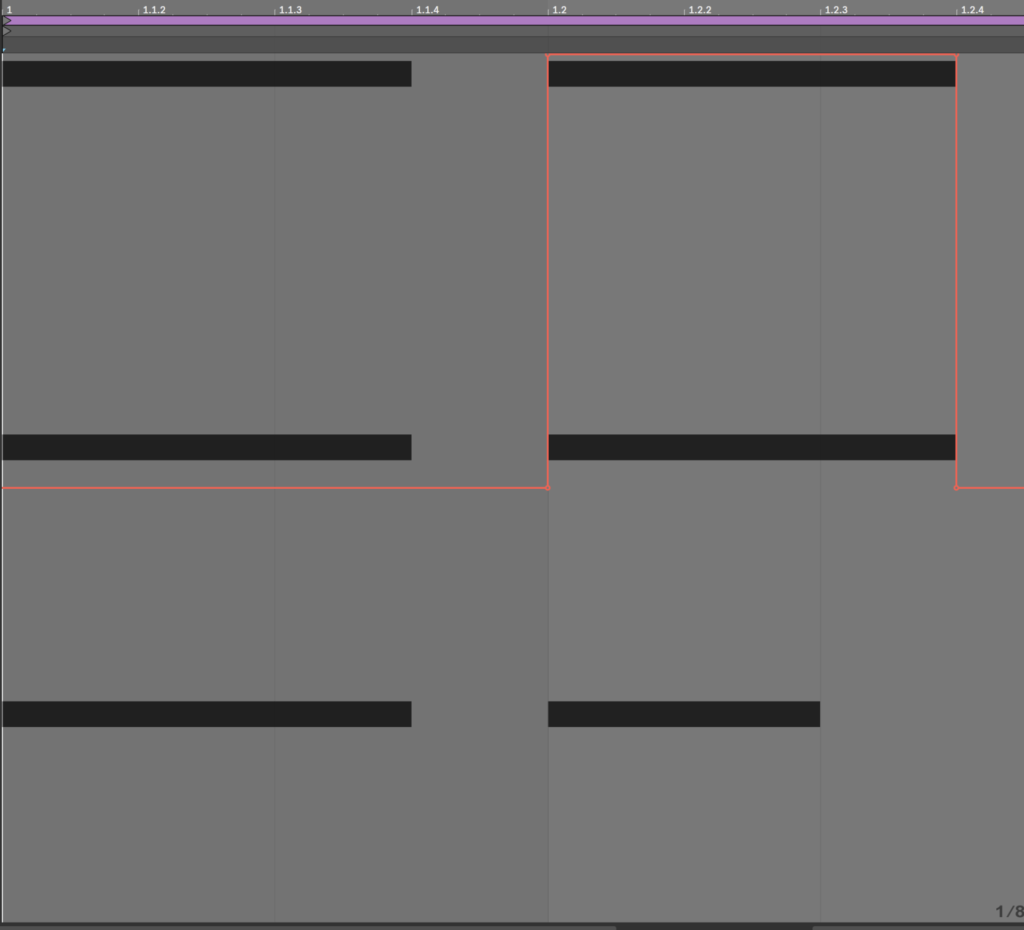 この場合7連符を打ち込んで、4と3でグルーピングして変わった跳ね方を作っています。0キーはエフェクトなどのミュートにも使えるので、覚えておくといろいろ活用できると思います。