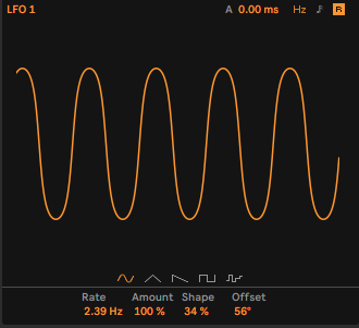 私はLFOをポジションに設定しました。純粋なサイン波だけじゃない波形で微妙に揺れてる感じが欲しかったので軽く。LFOは曲調によってもっとスピードを早めてもいいんじゃないでしょうか。