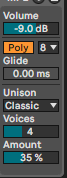 あとはUnisonを好みで。私はちょっと古い感じにしたかったので、最終的にClassicにしました。Wavetableのポジションにしたり、フェイザー的な効果をえたり、いろいろ出来ます。Ableton付属のシンセでは1番Unisonのモードが多いのでいろいろ遊べますね。