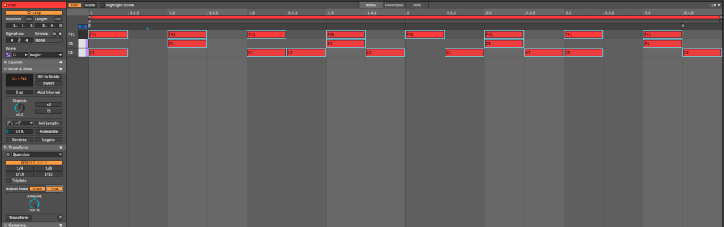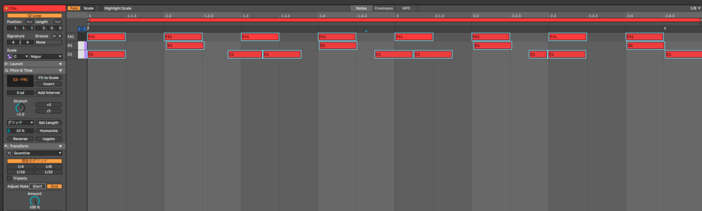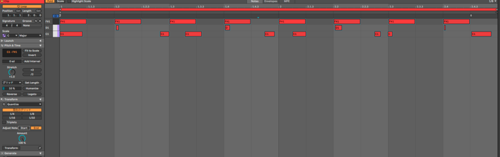 あらら、長さは8分音符になってますうけど、こうじゃないですよね…始点も長さもクオンタイズしてもらわないと困ります。