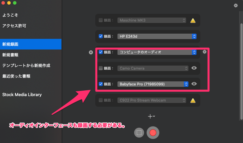 - PCの画面、録画でコンピュータのオーディオ、オーディオインターフェースも録画にする