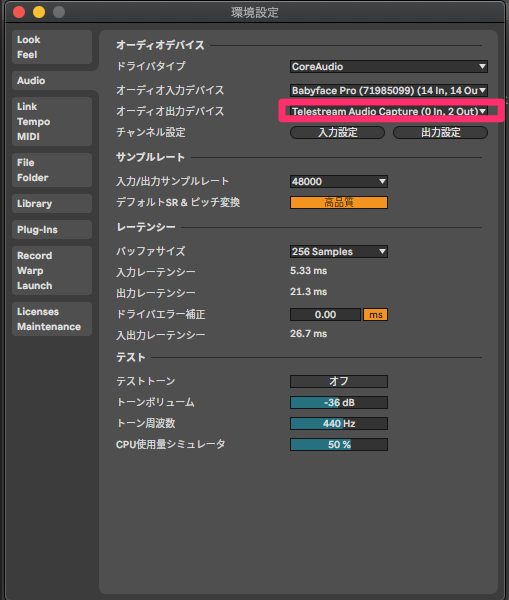 - オーディオの出力を「Telestream Audio Capture」に設定する。