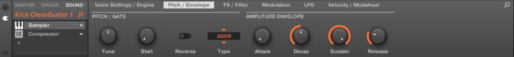 これ、ADSRになっているのは理由あります。ロングトーンと短い音でバリエーションつけたいからですね。まあ、私ならキック2音色作るけど…