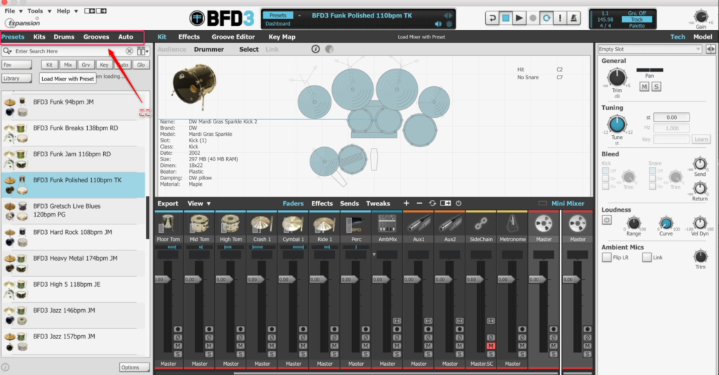 違うんやよ。Presetsってのは、キットの設定やらミキサーの設定やらGrooveの設定やら全部のせってことやな。