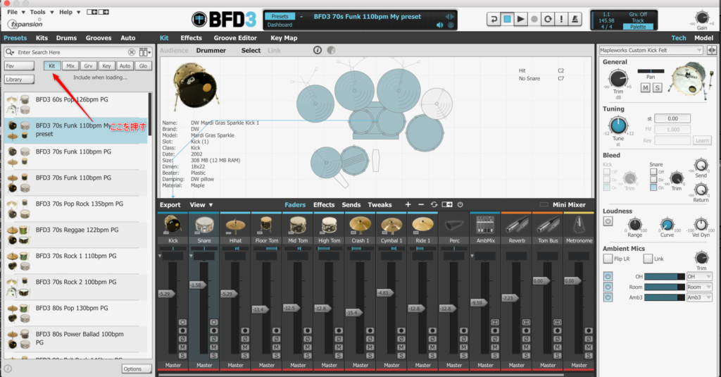 - kitsを変えるほうがいいと思った場合はpresetのMixの状態は保ちながらkitを変える
