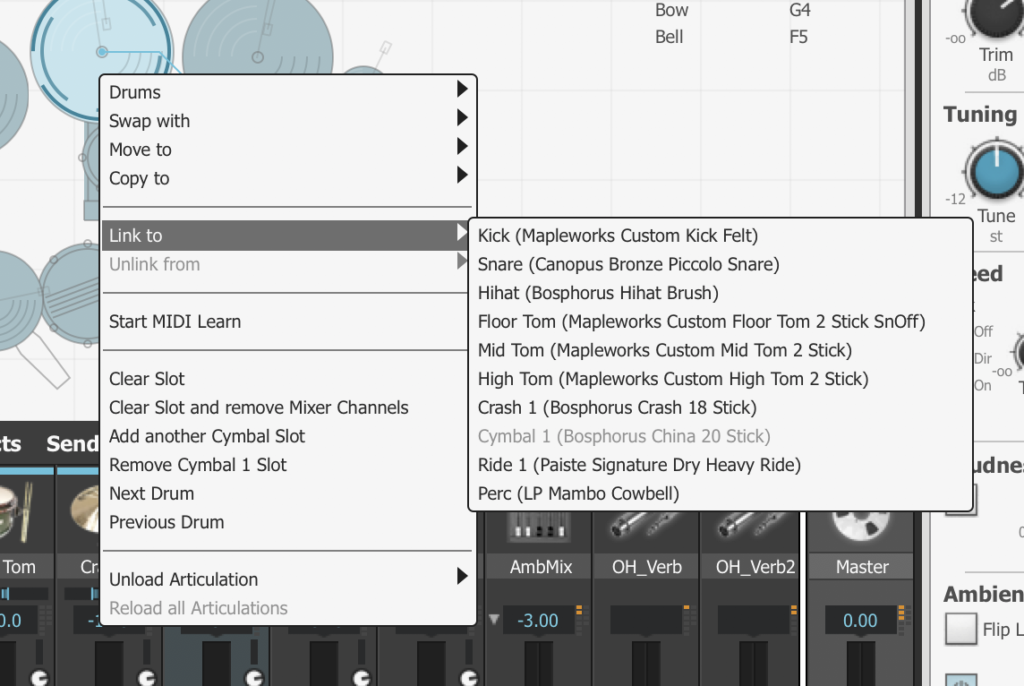 シンバルとキックをリンクさせたいんで、シンバルの上で右クリック「Link to」を設定してKickにするといい。そうしたら同時になるね。