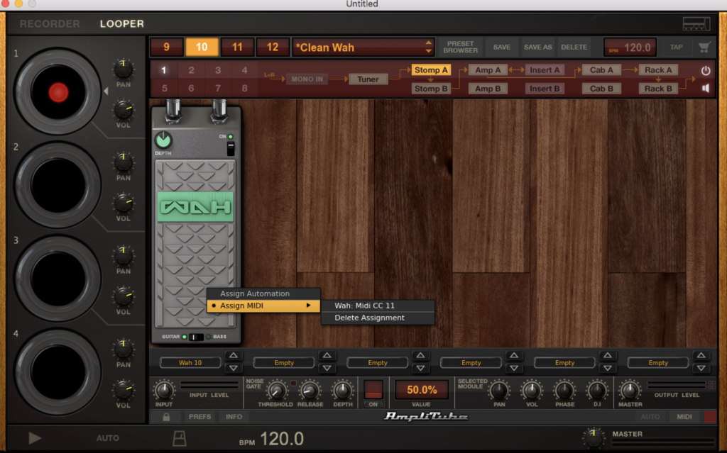 で、これはSlot1にワウを呼び出しました。で、エクスプレッションペダルはCC11に割り振られているので、ペダル上で右クリックしてアサインします。