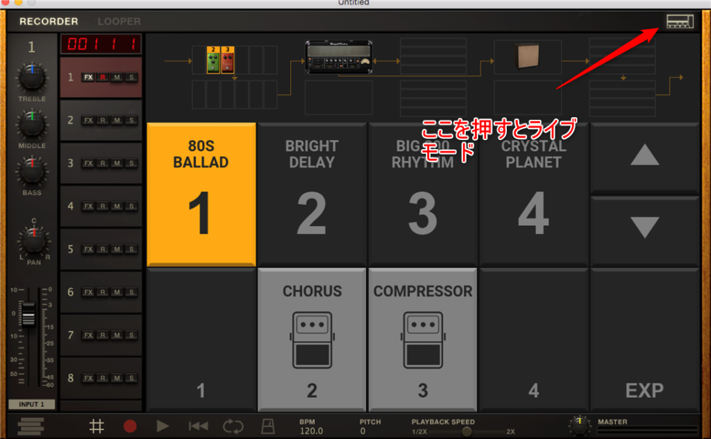 なので、エフェクターのオン・オフをする場合はまた別のモード、ストンプモードというのにします。