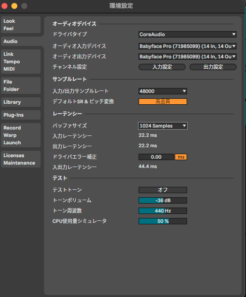 Ableton Liveの環境設定を開き、オーディオタブに移動します。