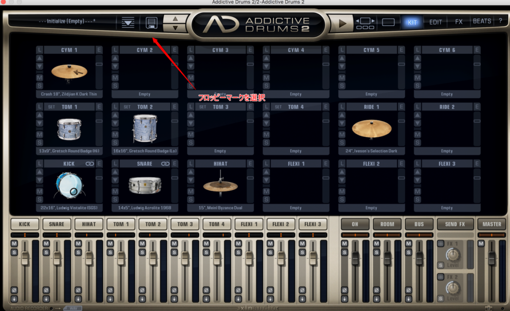 まず、初期状態の何もないものにして自分の好みのドラムキットを作るとええかな。もちろん気に入ったものがある人はそのままでも構わんよ。