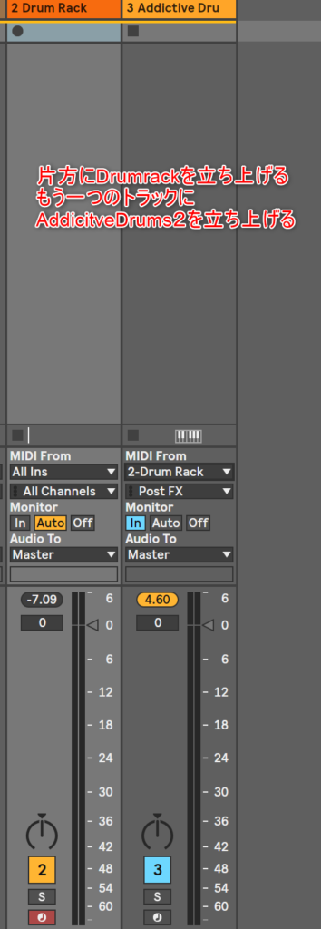 今回の設定のはDrumrackとAddictive Drums2を2つのトラックに立ち上げることにある。