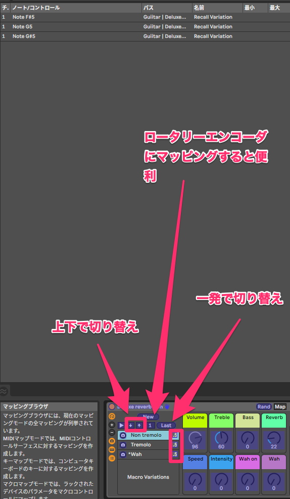 で、1と書いてあるところ、ロータリーエンコーダにマッピングするとめちゃくちゃ便利ですね。Macro Variationsは無制限に保存できます。