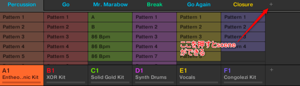 こういうPatternのまとまりをSceneって言います。このSceneはイントロってつけたらわかりやすいね。