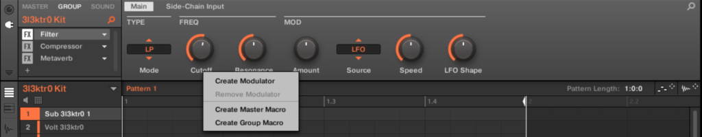 はい。じゃあやってみるね。まず、フィルターでカットオフを設定したい。だから、「cut-off」と書いてあるところを右クリックする。今回は、ドラム全体にカットオフを適用したいので、「Create Group Macro」やね。もちろん、トラック全体なら「Create Master Macro」や。
