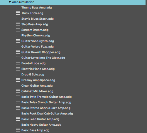 注意しなければならないのは、Audio Effect Rackに入っていることですね。ちなみにプリセット19種類はSuiteなどにあるものと同一です。クリーン、クランチ、ハイゲイン系と一通り揃ってますね。