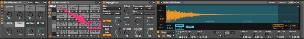 ドラムラックにアルペジエイターをドラッグします。まず、こっちは32分にしてみましょうか。