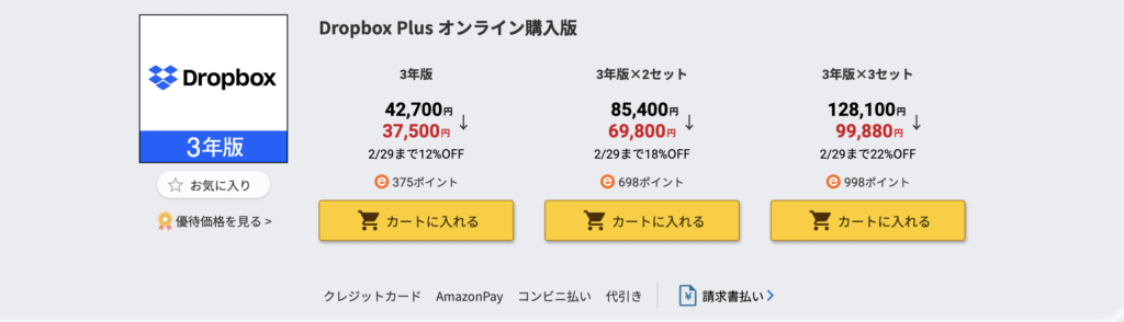 長く使うならDropbox公式より、ソースネクストの3年版が一番安いです。無料版もありますけど、フルに使う場合はPlusからになると思います。月払いだと1500*12=18,000円。年払いだと14,400円です。