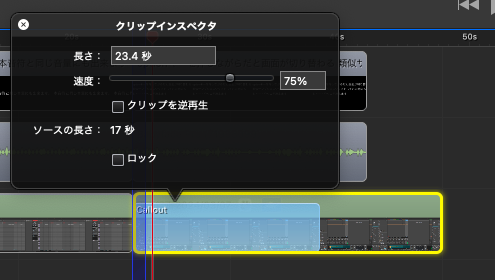 「クリップインスペクターを表示」して、スライダーを使用するか、パーセンテージ値を手動で入力。スライダーを使ったほうが速い。