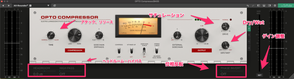 VCA Compressorでも便利だったHF Makeup,Sidechain PunchはOPTO COMPRESSORでもあります。こんなのはじめは「使わんやろ…EQ使うし」と思っていたんですが、思った以上に使いますね。