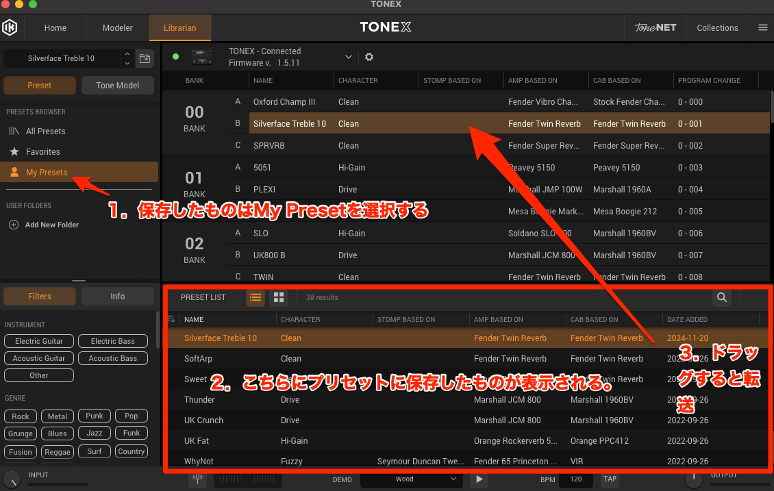 なんでこんな勘違いしたかというと、TONEXソフトウェア(スタンドアローン)を立ち上げたときにプリセットの変更やバンクチェンジは画面に反映されるからなんですね。