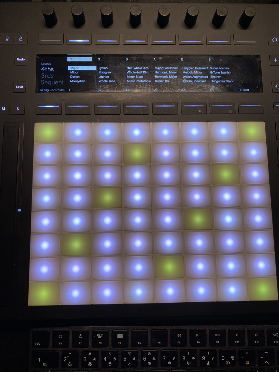 PUSHの場合は、三角形の形で押さえればダイアトニックコードのトライアドが押さえられたのですが、Sequentモードになってますね。音が重ならないモードになっています。