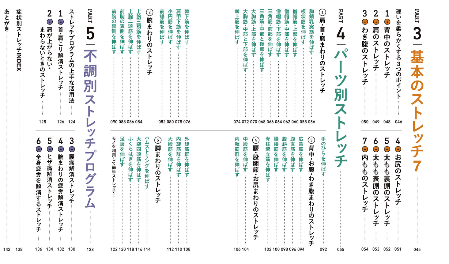 ストレッチ、やると確実に楽になるんですけど、こんなの毎日時間掛けてられないよという方にもPART5の不調別ストレッチがあるのは使いやすいんじゃないでしょうか。