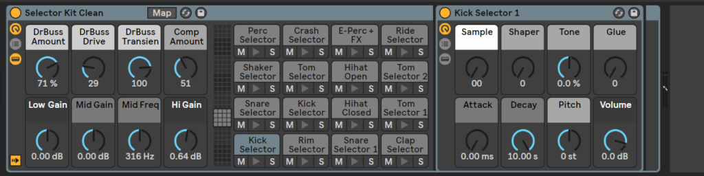 ぢゃぽんさん、これで、DrumRackを展開して、それぞれのボリュームを調整できます。Mixを押して、Drumrackが読み込んであるトラックを押してください。Panやセンドもこれで出来ます。